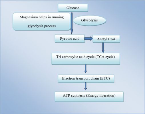 - Magnesium helps in glucose metabolism. It participates in the enzymatic reaction of glycolysis, where glucose is converted into pyruvic acid, which helps to liberate energy through TCA cycle and electron transport chain. It helps to utilize glucose completely by producing energy and inhibits unnecessary glucose accumulation within blood