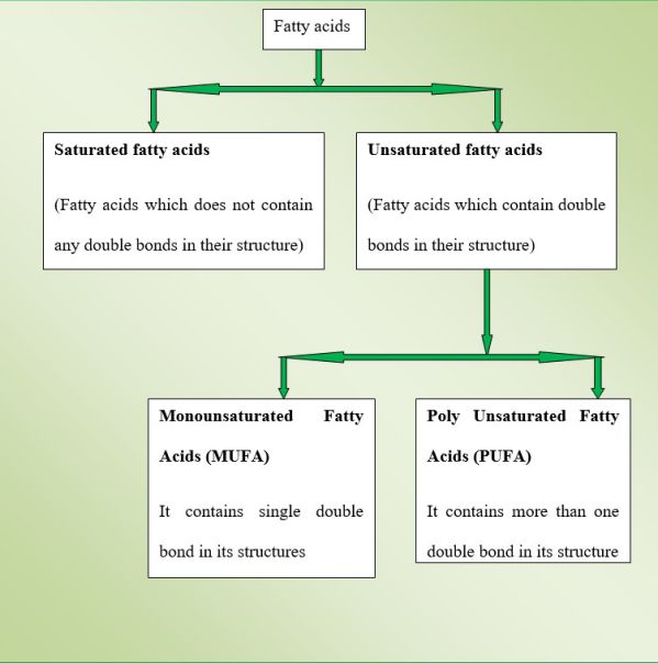 - Fatty acids are mainly of two types, which are – saturated fatty acids and unsaturated fatty acids. The below table shows the classification of fatty acids–